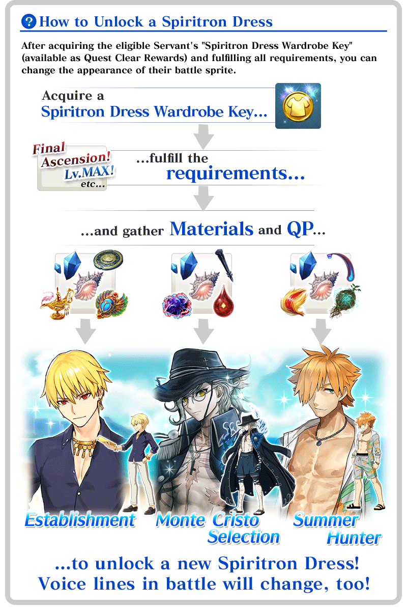 * If you do not own "★5 (SSR) Edmond Dantès", "★4 (SR) Gilgamesh (Caster)", or "★3 (R) Robin Hood", you can still acquire their Spiritron Dress Wardrobe Key, but it will not be usable.