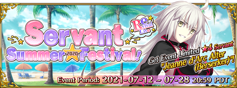 For information about the Limited Time Event "Revival: Servant Summer Festival! Lite" and the ongoing "Revival: Servant Summer Festival Pickup 1 Summon (Daily)" and "Revival: Servant Summer Festival Pickup 2 Summon",