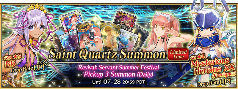 | 2021-07-18 21:00 - 07-19 20:59 PDT | ★5 BB | ★4 Medb (Saber) ★4 Mysterious Heroine XX (Foreigner) |