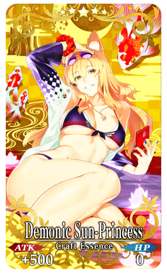 ★★★★★SSR Demonic Sun-Princess ATK 500 (MAX: 2000) HP 0 Skill Increase NP Strength by 10% & Arts Card Critical Strength by 15% & begin battle with NP charged at 30% for yourself + Increase appearance rate of Bonus enemies by 15% in "All In! Las Vegas Championship Match - Seven Duels of Swordbeauties!" [Event Only]