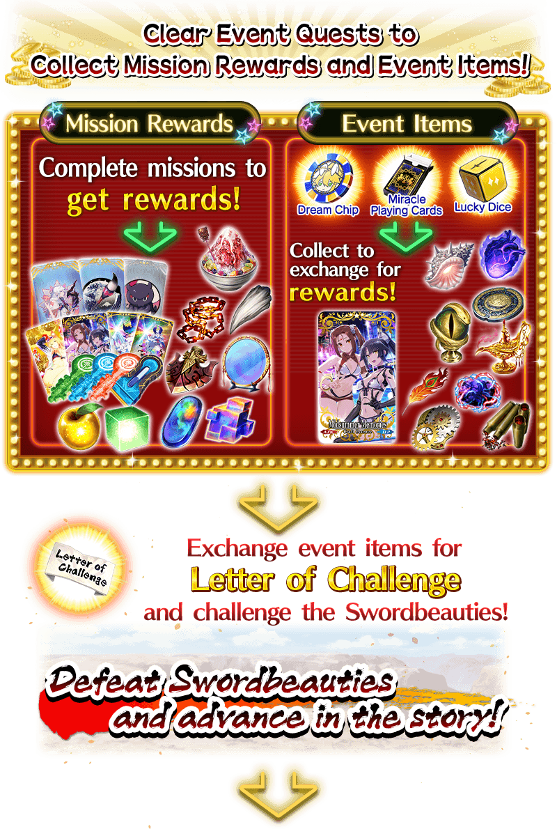 Missions within the Limited Time Event "All In! Las Vegas Championship Match - Seven Duels of Swordbeauties!" will require you to complete missions such as "win a certain amount of QP" or "defeat a certain type of enemy." Clear these missions to receive lavish rewards!