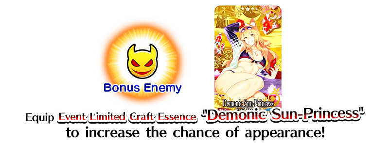 Bonus Enemies have a low chance of appearing in each Free Quest. You can increase the chance of Bonus Enemy appearance by 15% by equipping the Event Limited Craft Essence "★5 (SSR) Demonic Sun-Princess", available as event rewards.
