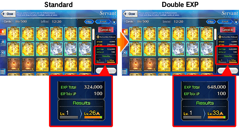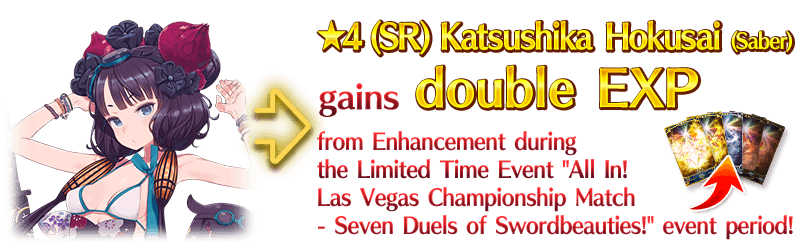 For the duration of the event period, "★4 (SR) Katsushika Hokusai (Saber)」will receive double EXP when performing Enhancement.