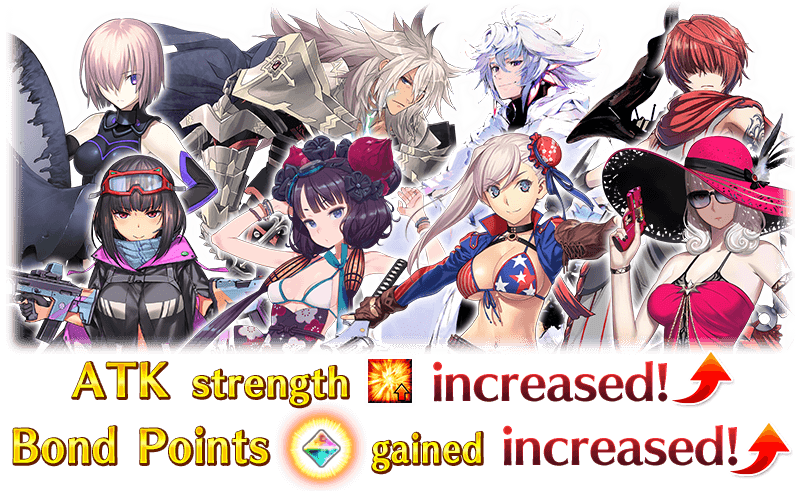 The Servants listed below will receive bonuses to their ATK strength and Bond Points Acquired within this event.
