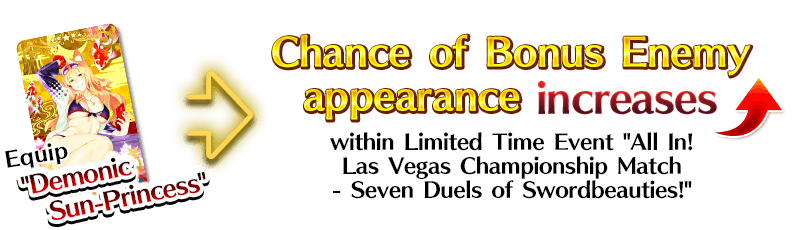 ★★★★★SSR Demonic Sun-Princess ATK 500 (MAX: 2000) HP 0 Skill Increase NP Strength by 10% & Arts Card Critical Strength by 15% & begin battle with NP charged at 30% for yourself + Increase appearance rate of Bonus enemies by 15% in "All In! Las Vegas Championship Match - Seven Duels of Swordbeauties!" [Event Only]