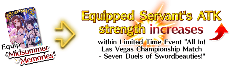 Equip the Event Limited Craft Essence "★5 (SSR) Midsummer Memories", available through Event Item Exchange, to gain an ATK bonus for the equipped Servant.