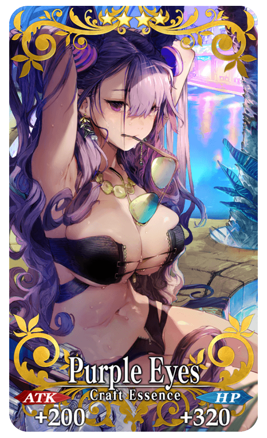 ★★★★SR Purple Eyes ATK 200 (MAX: 750) HP 320 (MAX: 1200) Skill Increase Arts Card effectiveness by 8% & Buster Card effectiveness by 8% & Critical Strength by 5% for yourself + Increase Miracle Playing Cards amount per drop by 1 [Event Only]