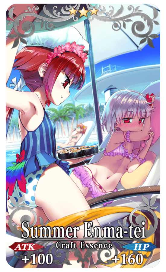 ★★★R Summer Enma-tei ATK 100 (MAX: 500) HP 160 (MAX: 800) Skill Apply Evade (1 time) & increase NP Strength by 5% for yourself + Increase Lucky Dice amount per drop by 1 [Event Only]