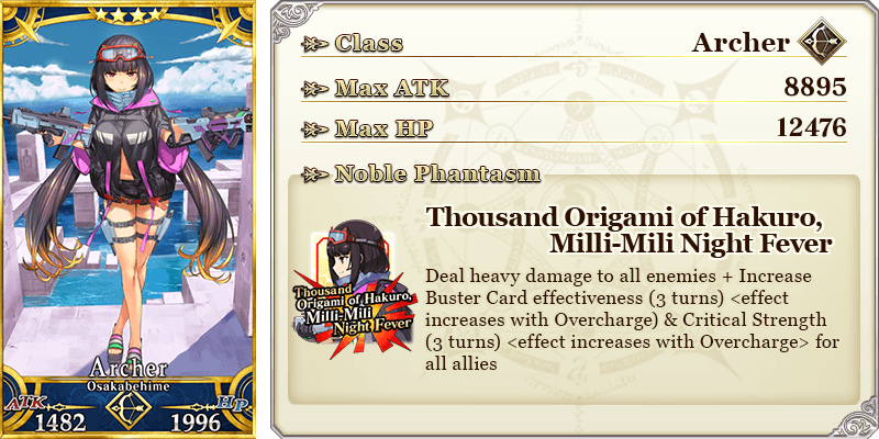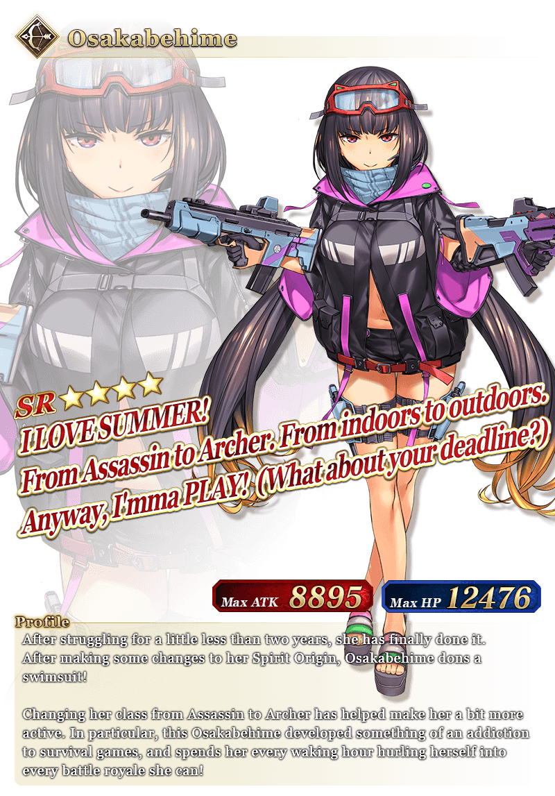 | 2021-08-15 21:00 - 08-18 20:59 PDT | ★5 Miyamoto Musashi (Berserker) | ★4 Osakabehime (Archer) ★4 Carmilla (Rider) |