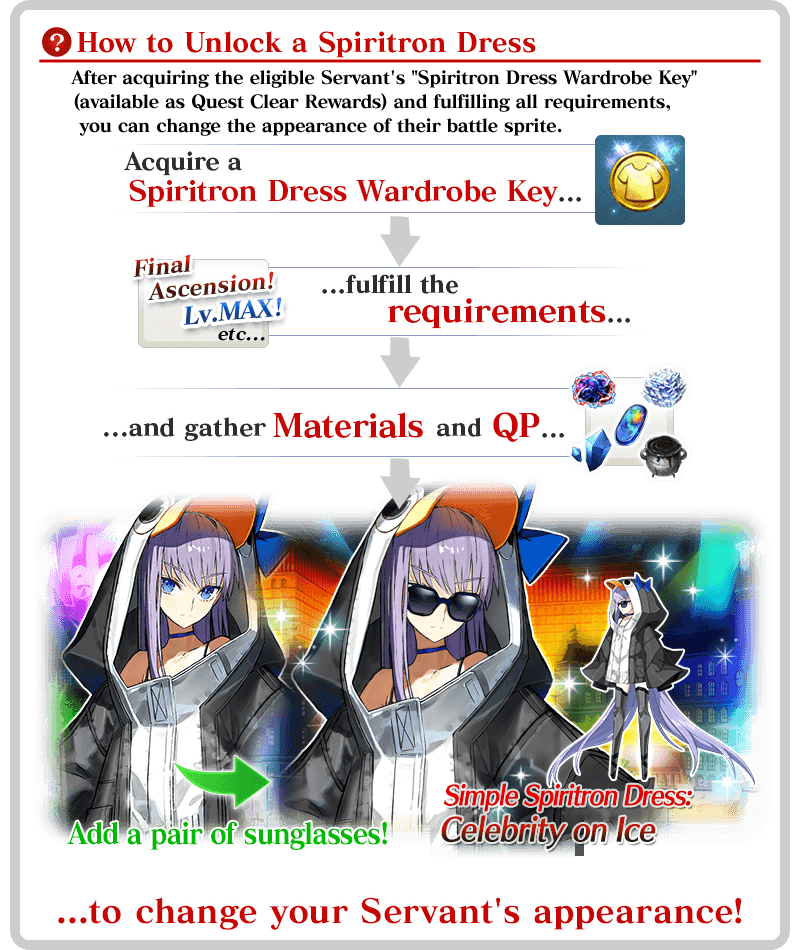 * Upon unlocking a Spiritron Dress, the Servant's battle sprite and icons will automatically be changed. You can revert back to the original appearance or change to a different Ascension level from the Servant Details screen.