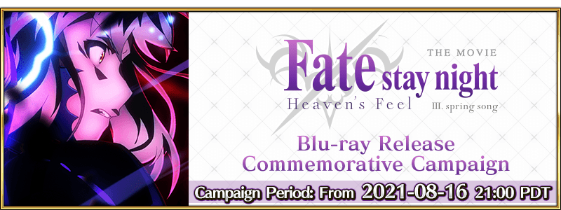 To celebrate the release of "Fate/stay night [Heaven's Feel] Ⅲ.spring song" on Blu-ray, we're holding a "Fate/stay night [Heaven's Feel] Ⅲ.spring song" North America Blu-ray Release Commemorative Campaign!