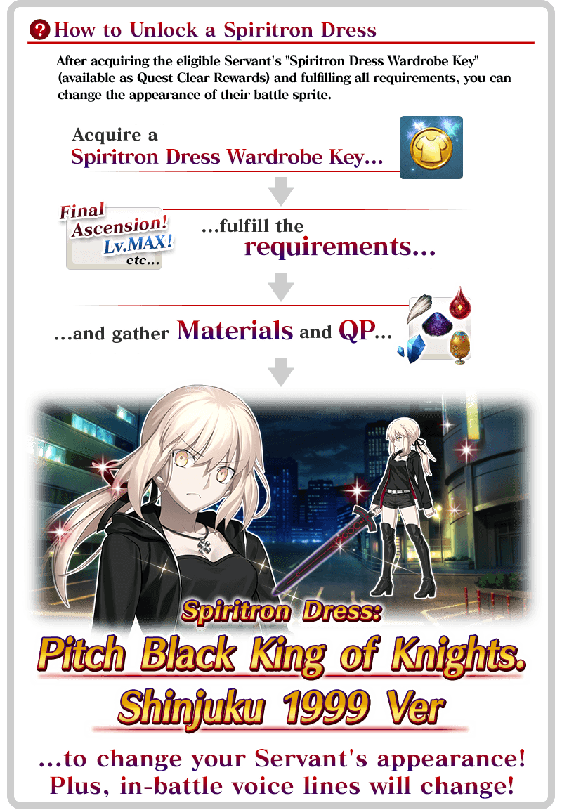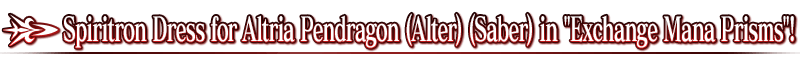 * The Spiritron Dress added for "★4 (SR) Altria Pendragon (Alter) (Saber)" will change her appearance and certain voice lines.