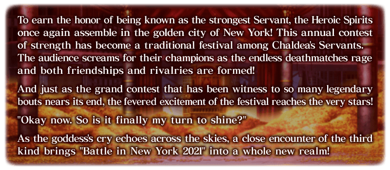 For Masters who missed the story of the 2020 Limited Time Event "Battle in New York 2020", a Revival version of the Main Quest will be available during the event period of the Limited Time Event "Battle in New York 2021".