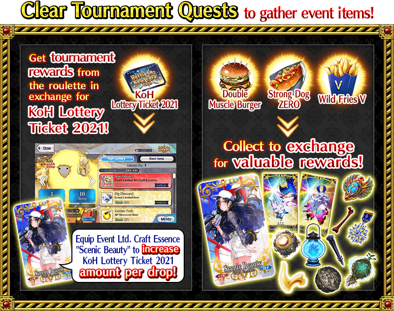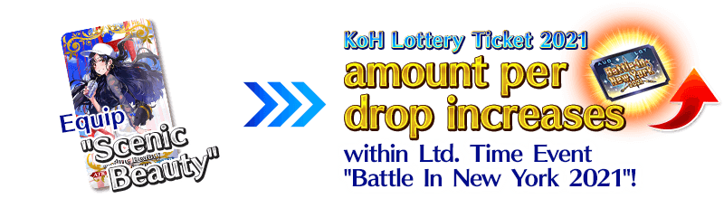 Equip Event Limited Craft Essence "Scenic Beauty", available through Event Item Exchange, to gain a bonus to the amount per drop of the event item "KoH Lottery Ticket 2021".
