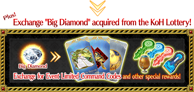 * From the 11th Prize Lineup and on, no Grand Prize, Golden Fruit, or Silver Fruit will be replenished. "Prize Reset" will become available after you have claimed all items in a lineup. * The event item "Big Diamond" available through the KoH Lottery can be exchanged for Event Limited Command Codes and other valuable items. * "KoH Lottery Ticket 2021" will disappear at the end of the Exchange Period.