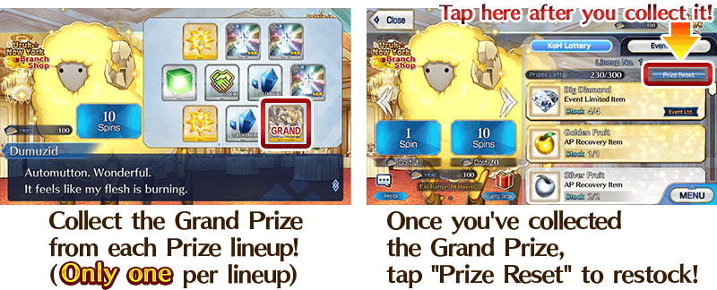 Once you've collected the Grand Prize, tap "Prize Reset" to replenish the Prize Lineup with new items and a new Grand Prize.