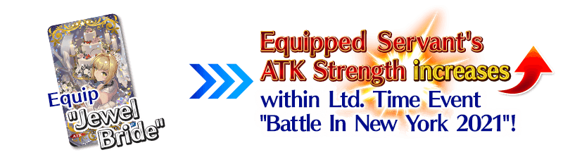 Equip Event Limited Craft Essence "Jewel Bride", available in the Uruk New York Branch Shop, to gain an ATK bonus for the equipped Servant within Limited Time Event "Battle in New York 2021".
