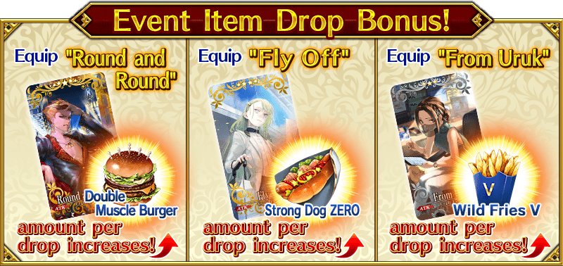 Equip Limited Time Craft Essences "Round and Round", "Fly Off", and "From Uruk", available through the ongoing Pickup Summon, to gain a bonus to the amount per drop of the event items "Double Muscle Burger", "Strong Dog ZERO", and "Wild Fries V".