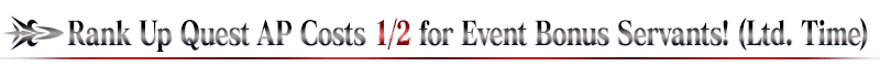 During the period below, Rank Up Quest AP costs will be halved for eligible Servants! * AP costs will be halved even if you withdraw from a battle.