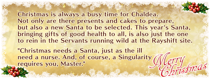Event Limited Servant "★4 (SR) Florence Nightingale (Santa)" will temporarily join your party as you progress in the Main Quest.