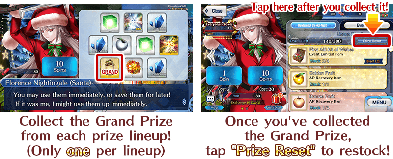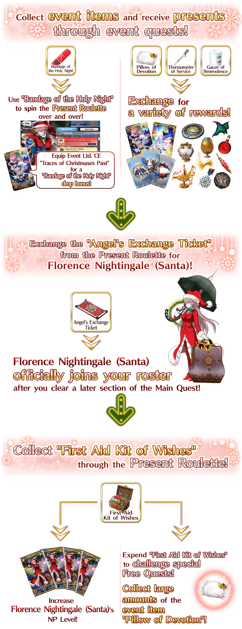 * Grand Prize items, "Golden Fruit", and "Silver Fruit" will not be included in the 11th and further Present Lineups. * Event item "First Aid Kit of Wishes", included in each Present Lineup, can be exchanged for “Florence Nightingale (Santa) [For NP Enhancement]”, various materials, or to challenge special Free Quests. * "Bandage of the Holy Night" will disappear at the end of the Exchange Period.