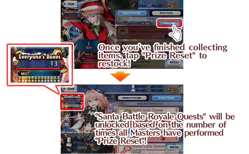 "Everyone's Boxes" records the number of times all Masters have performed "Prize Reset". When it reaches a certain level, a "Santa Battle Royale Quest" will be unlocked!