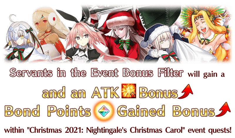 * Eligible Servants will not necessarily appear in the event story. * From 2021-12-12 20:00 PST, an "Upcoming Event" filter will be added to the Servant Selection and Servant Enhancement screens. Use this filter to conveniently display only the Servants who will receive a bonus in the event.