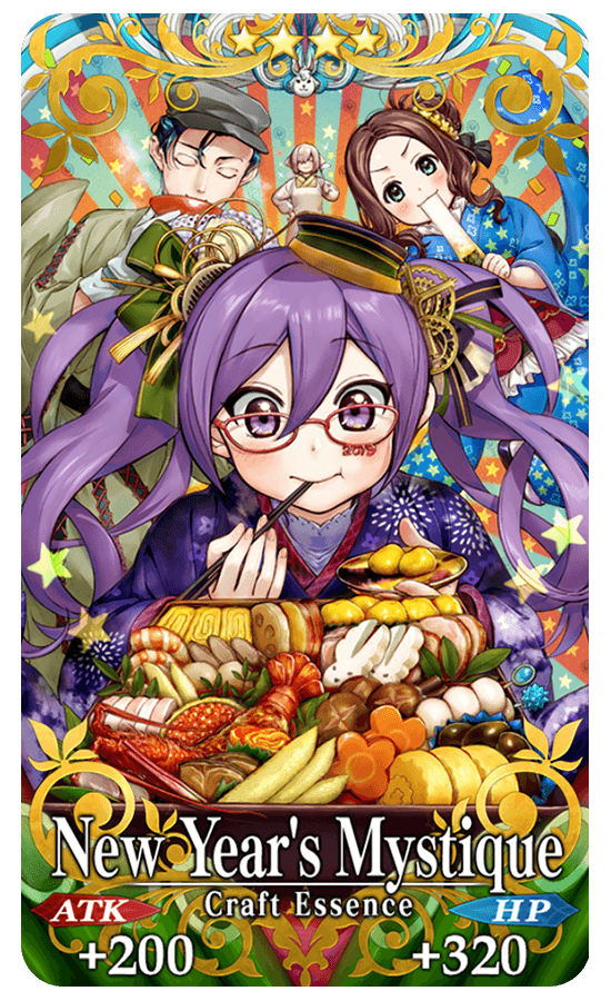 ★★★★SR New Year's Mystique ATK 200 (MAX: 750) HP 320 (MAX: 1200) Skill Increase Quick Card effectiveness by 6% & Arts Card effectiveness by 6% & increase NP Gauge by 4% per turn for yourself + Increase Bounty of the River amount per drop by 1 [Event Only]