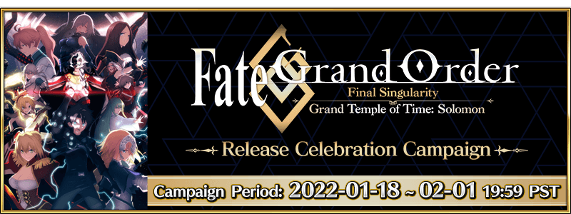 Together with the announcement of releasing the "Fate/Grand Order Final Singularity Grand Temple of Time: Solomon" over streaming platforms, a special campaign will be released in-game to celebrate the occasion.