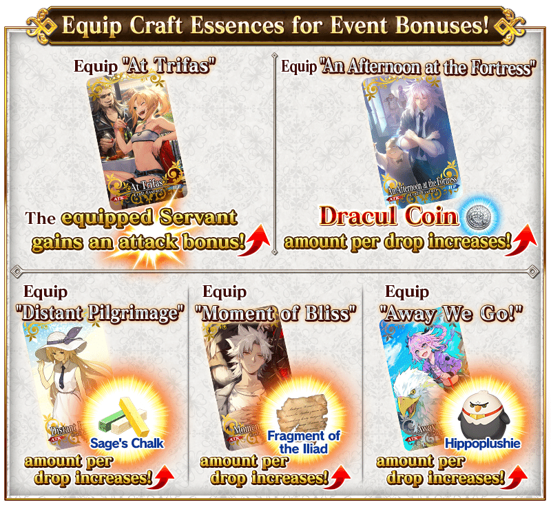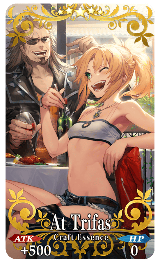The Event Limited Craft Essence available through “Dracul Coin” Rewards “★5 (SSR) At Trifas” grants an ATK bonus to the equipped Servant during Event Quests.