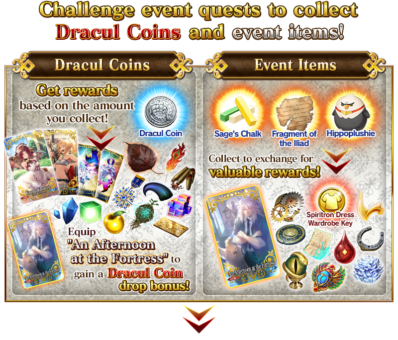 Obtain “★5 (SSR) An Afternoon at the Fortress” through Event Item Exchange for a bonus to the number of “Dracul Coins” per drop in Event Quests when equipped.