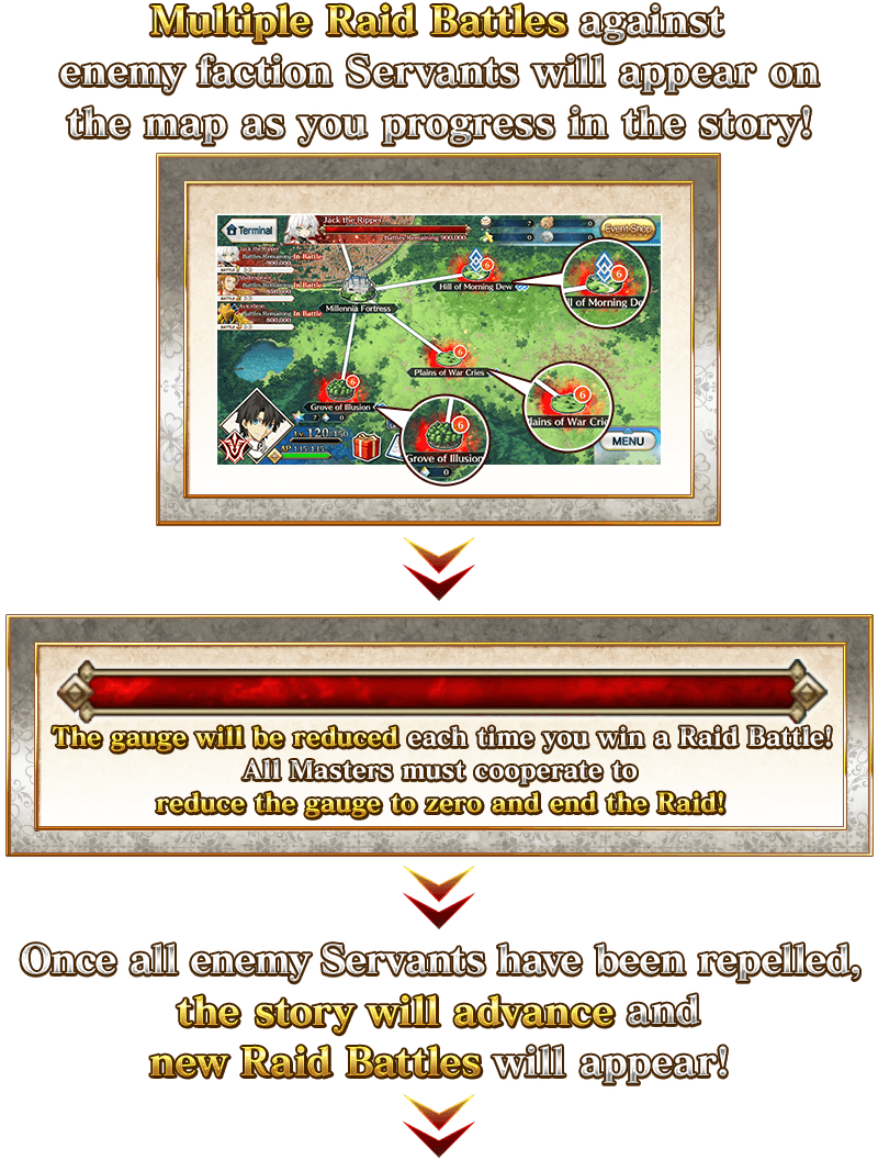 In this event, multiple Raid Battles against Servants of the enemy faction will appear simultaneously and repeatedly.