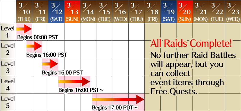 Raid Battles will be divided into five levels, beginning at 2022-03-10 00:00 PST and concluding on 2022-03-17.