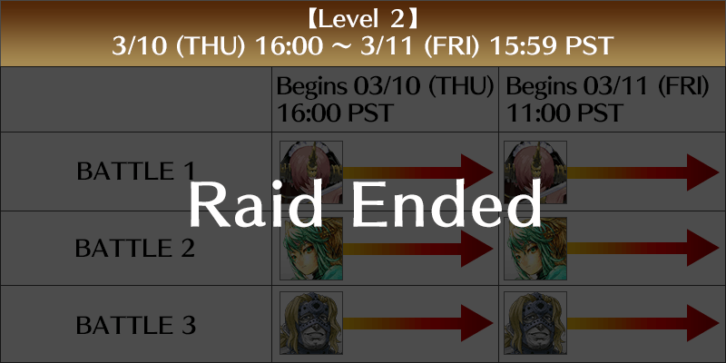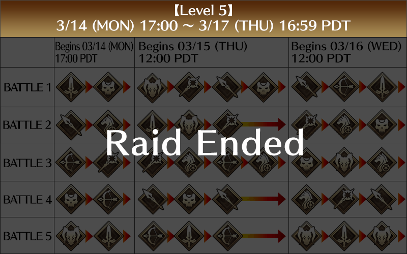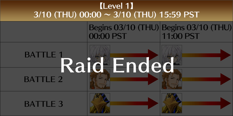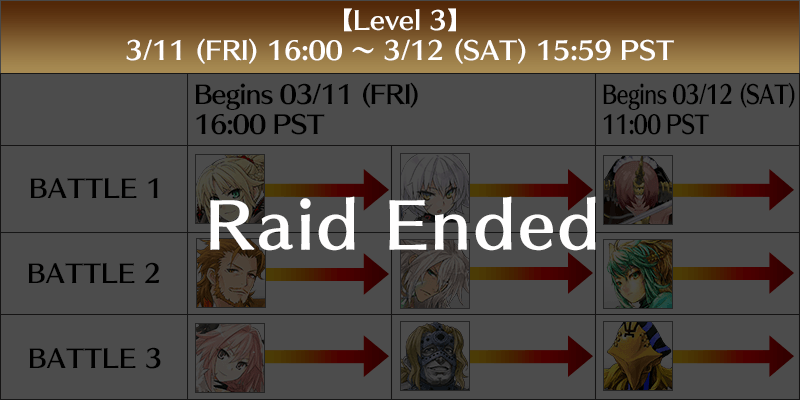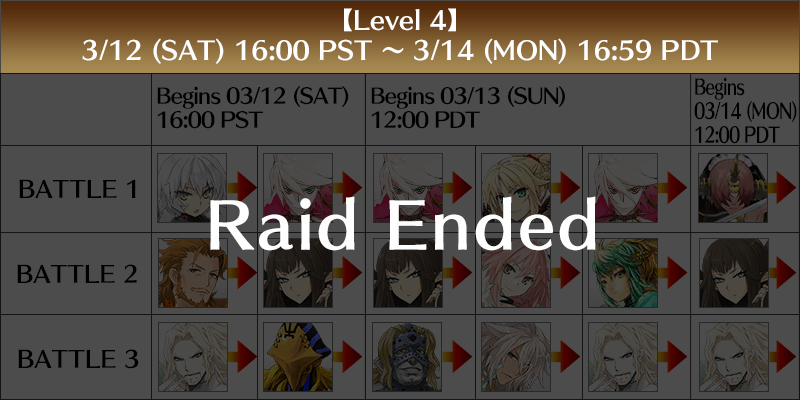 Raid Battles will occur as enemy faction Servants manifest simultaneously. They will be divided into five levels, beginning at 2022-03-10 00:00 PST and concluding on 22-03-17 PDT.
