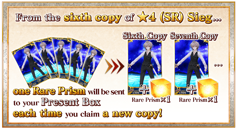 Once you have acquired a total of six copies of "★4 (SR) Sieg", one Rare Prism will be awarded for each new copy, beginning with the sixth.