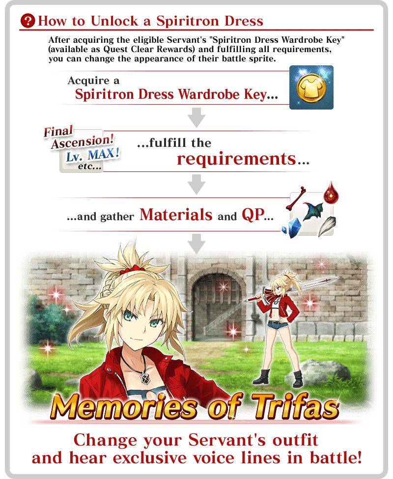 * Upon unlocking a Spiritron Dress, the Servant's battle sprite and icons will automatically be changed. You can revert back to the original appearance or change to a different Ascension level from the Servant Details screen.