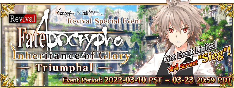 | 2022-03-10 00:00 - 03-10 19:59 PST | ★4 Siegfried ★4 Atalante ★4 Chiron ★4 Astolfo (Rider) ★4 Atalante (Alter) ★4 Frankenstein (Berserker) ★3 Avicebron |