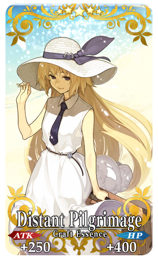 ★★★★★SSR Distant Pilgrimage ATK 250 (MAX: 1000) HP 400 (MAX: 1600) Skill Increase NP Gain by 10% & NP Strength by 10% & begin battle with NP charged at 40% for yourself + Increase Sage's Chalk amount per drop by 1 [“Revival: Apocrypha/Inheritance of Glory” Event Only]