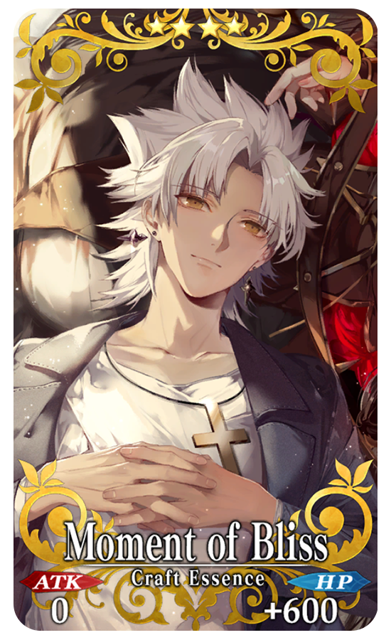 ★★★★SR Moment of Bliss ATK 0 HP 600 (MAX: 2250) Skill Increase Arts Card effectiveness by 8% & Buster Card effectiveness by 8% & DEF by 3% for yourself + Increase Fragment of the Iliad amount per drop by 1 [“Revival: Apocrypha/Inheritance of Glory” Event Only]