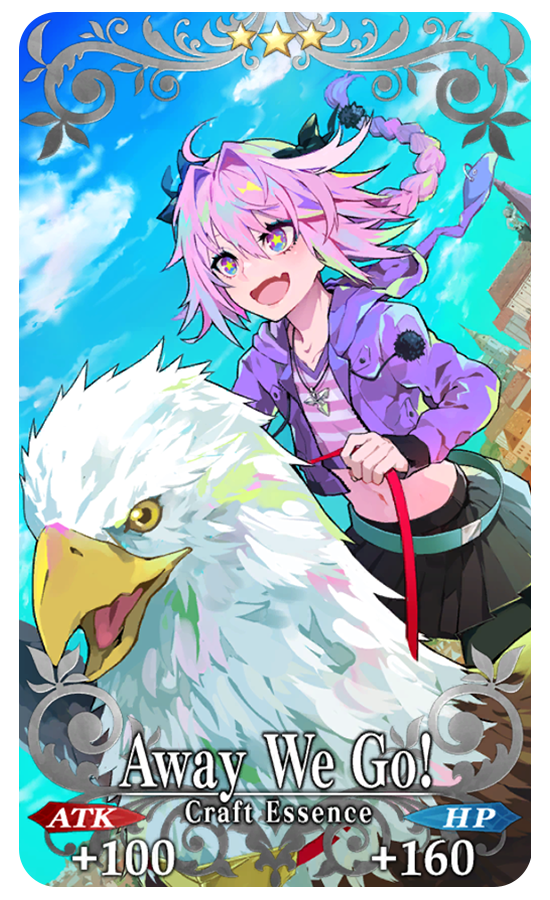 ★★★R Away We Go! ATK 100 (Max: 500) HP 160 (Max: 800) Skill Increase Quick Card effectiveness by 3% & NP Gain by 5% for yourself + Increase Hippoplushie amount per drop by 1 [“Revival: Apocrypha/Inheritance of Glory” Event Only]