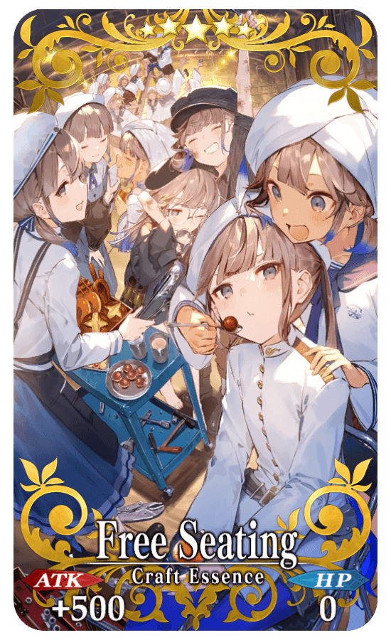 ★★★★★SSR Free Seating ATK 500 (MAX:2000) HP 0 Skill Increase the amount of QP obtained from drops by 1% & increase Mystic Code EXP gained when completing a quest by 1% |