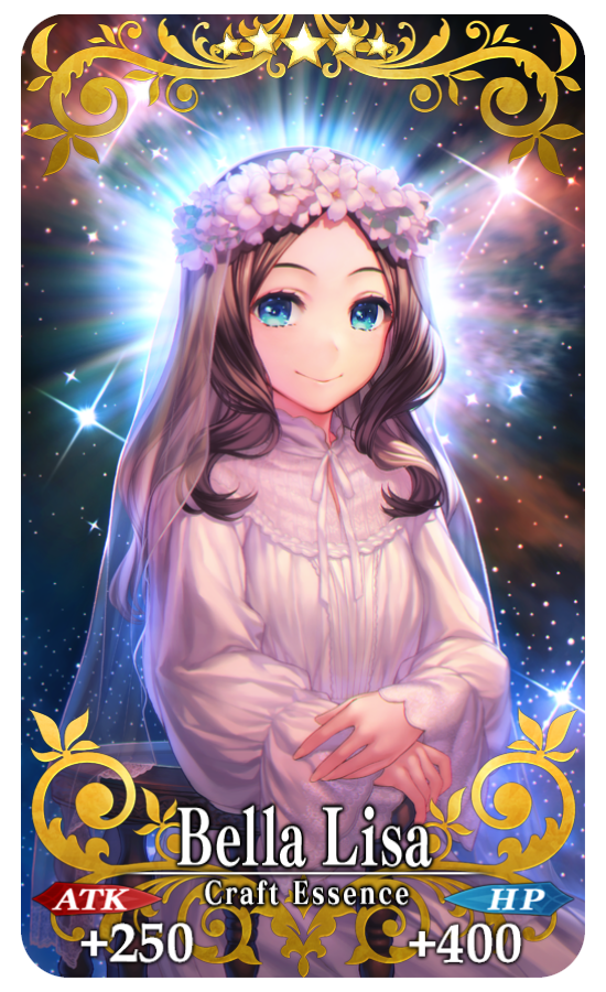 ★★★★★SSR Bella Lisa ATK 250 (MAX:1000) HP 400 (MAX:1600) Skill Increase the amount of QP obtainable from drops by 1% (3% if Support) |