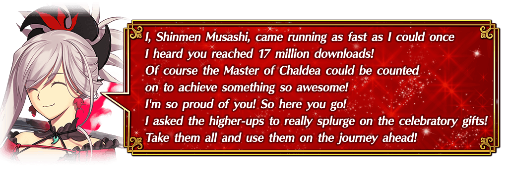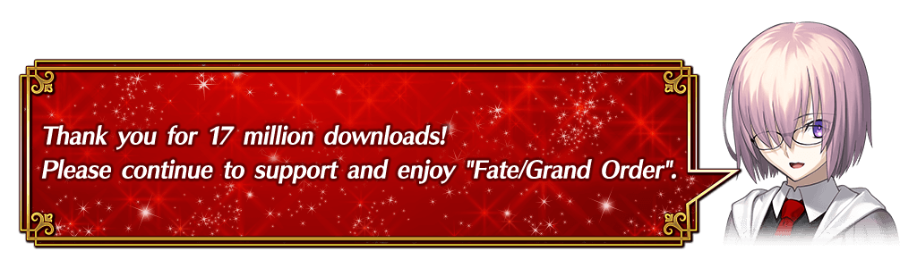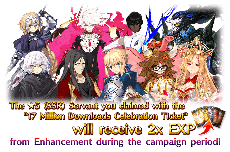 * When you exchange for a ★5 (SSR) Servant, the Servant will be sent to your Present Box and the "17 Million Downloads Celebration Ticket" will disappear.