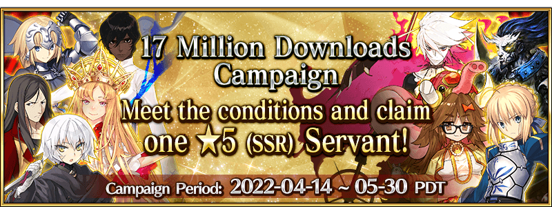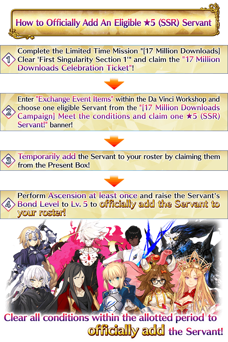 * If you do not fulfill the requirements to permanently add the ★5 (SSR) Servant you exchanged for with the "17 Million Downloads Celebration Ticket" by 2022-06-15 20:59 PDT , the Servant will be removed from your roster. Please be aware of the time limit.