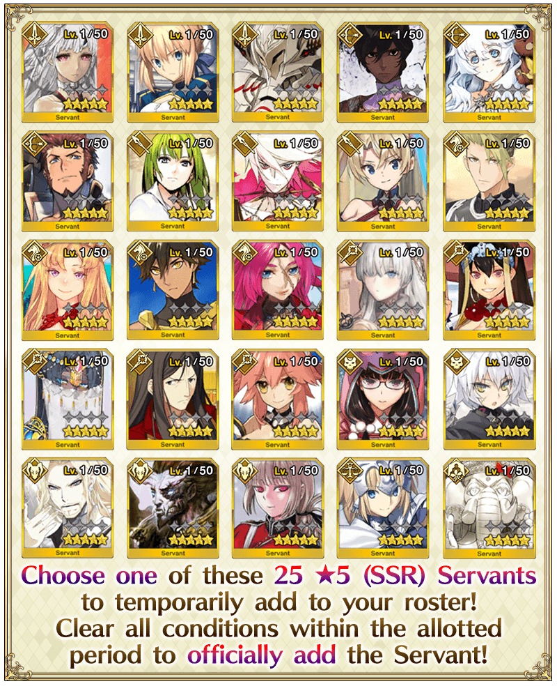 During the campaign period, you can permanently add one of the 25 eligible ★5 (SSR) Servants to your roster. You must follow the upcoming steps to "Temporarily Add" and then "Permanently Add" the Servant to your roster.