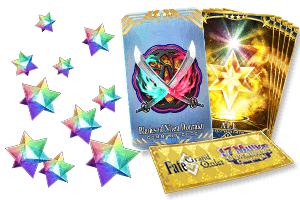 Saint Quartz x 15 Friend Points x 2,000 QP x 100,000 Blaze of Wisdom ALL ★4 (SR) x 20 Golden Fruit x 1 |