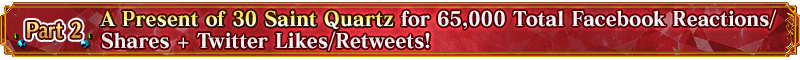 If you can help us get the Facebook and Twitter posts to a total of 65,000 Facebook Reactions/Shares and Twitter Likes/Retweets during the period below, we'll distribute 30 Saint Quartz (worth up to 11 Saint Quartz Summons) to all Masters to celebrate 17 Million Downloads!