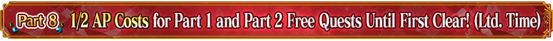 If you have cleared Main Quest Part 2 Chapter 5 "Lostbelt No.5: Interstellar Mountainous City, Olympus - The Day to Bring Down Gods", Free Quests within Part 1 and Part 2 through Chapter 5 (Olympus) will have their AP costs halved until the first time cleared! (AP costs will not change if you withdraw from battle as long as you have not cleared the quest before)
