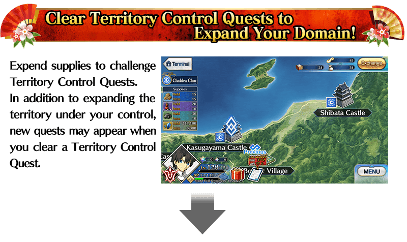 Execute Territory Control Quests by expending the supplies you've produced. Clear these quests to expand the land under your control and advance towards your goal of a unified nation. If you fail to clear a Territory Control Quest, the supplies expended will be returned to you.