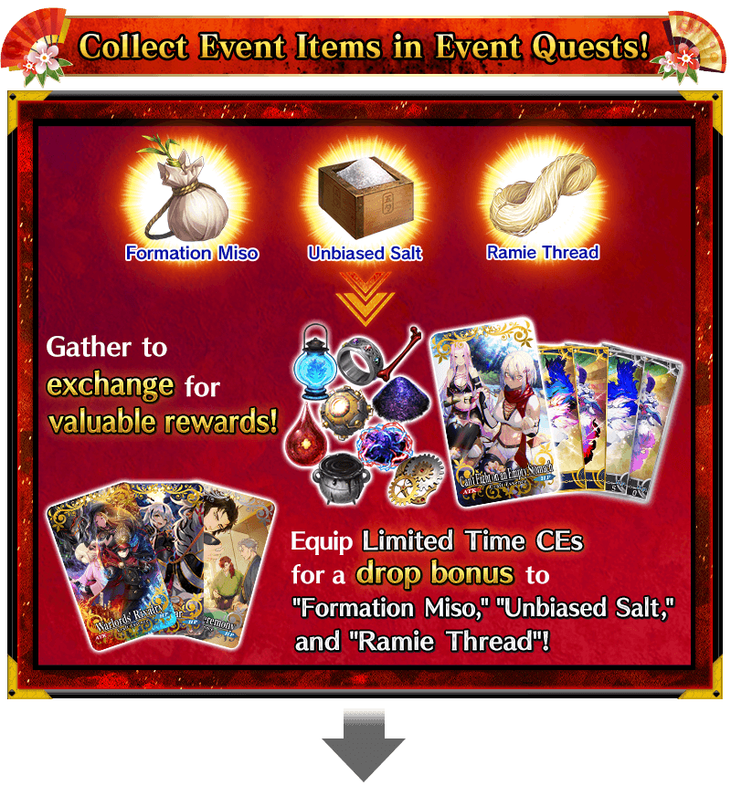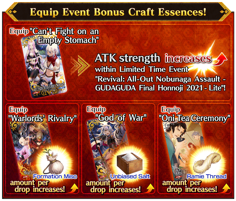 Servants equipped with the Limited Time Craft Essences "★5 (SSR) Warlords' Rivalry", "★4 (SR) God of War", and "★3 (R) Oni Tea Ceremony", available through the ongoing Pickup Summon, will receive a bonus to the amount per drop of event items "Formation Miso", "Unbiased Salt", and "Ramie Thread".